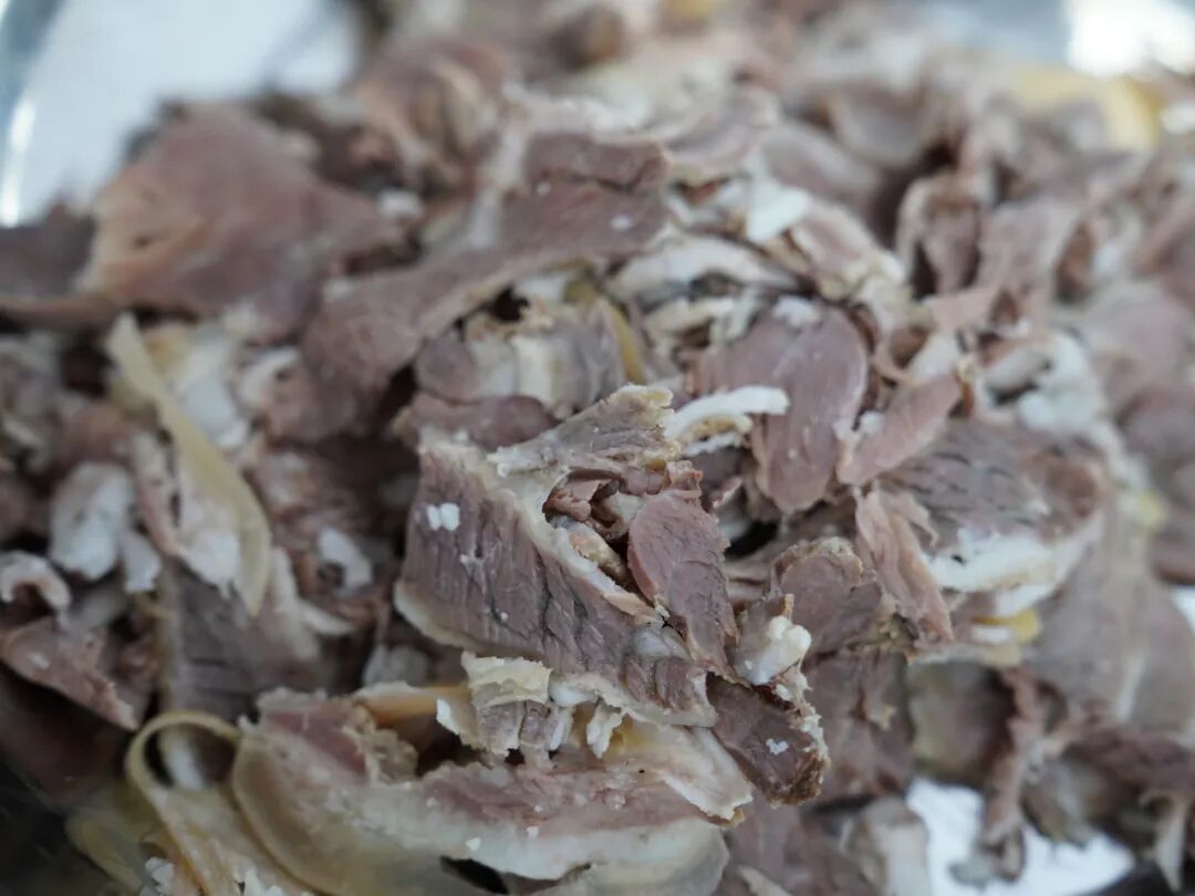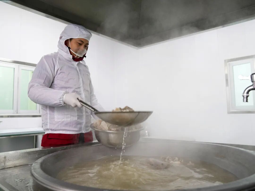 “我们的羊肉都是选用本地优质的白山羊,将带皮羊肉烧制后放入清水中清洗,再进入无菌车间熬煮。”